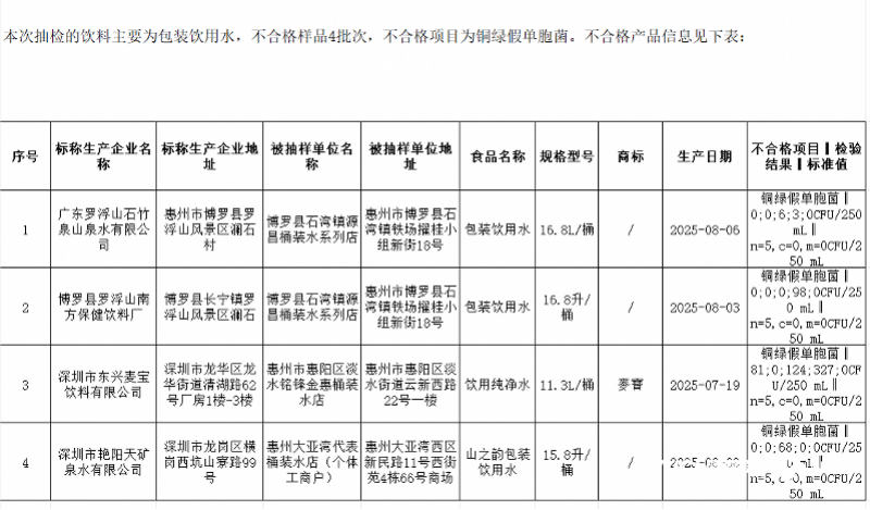 近日,此中,传递近期对粮食加工品、饮料、便利食物等7类1464批次食物的抽检成果。惠州大亚湾代表桶拆水店(个别工商户)发卖的、标称深圳市艳阳天矿泉水无限公司出产的 “山之韵” 包拆饮用水,落实下架、召回等风险节制办法,